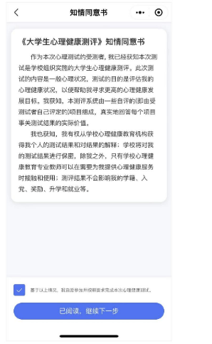 第五步:点击“开始测评”,阅读“知情同意书”,勾选“基于以上情况,我自愿参加并按照要求完成本次心理健康测试”,点击“已阅读,继续下一步”。