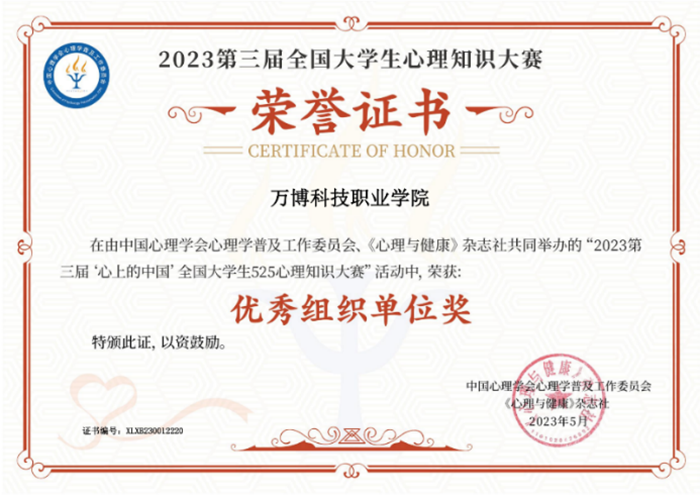 近日,由中国心理学会心理学普及工作委员会、《心理与健康》杂志社主办的“2023第三届‘心上的中国’全国大学生525心理知识大赛活动”圆满落下帷幕。万博科技职业学院学工部在院党委的支持与指导下积极组织学生参加“2023第三届‘心上的中国’全国大学生525心理知识大赛活动”。
