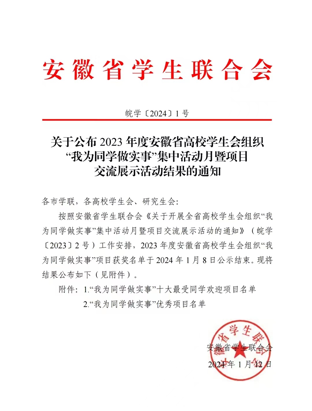 本次活动自发布评选通知以来,我校团委高度重视,积极组织校院学生会组织参评。经初评、复核、省学联十大代表投票等环节,我校学生会在2023年度安徽省高校学生会组织“我为同学做实事”集中活动月暨项目交流展示活动中的《弘扬志愿精神 助力学子出行》项目荣获”优秀项目”奖。