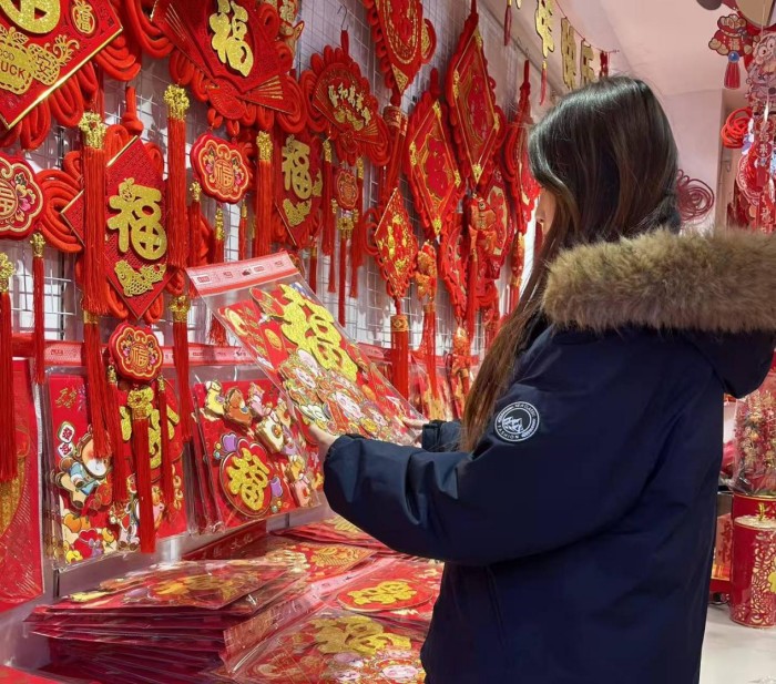 实践队走进城隍庙市集。红春联沿着巷弄铺成“暖色长卷”,生肖窗花映得玻璃发亮,绒布中国结的流苏随人流轻晃。队员们穿梭其间,指尖抚过烫金“福”字的凹凸纹路,鼻尖萦绕着糖炒栗子与春联墨香的交织气息;时而驻足观摩摊主剪刻窗花的灵巧手法,时而拿起绣着生肖纹样的香囊细细端详,在红绸与金饰的相映中,触摸传统年俗的温度。大家一边挑选寓意吉祥的年货,一边与摊主闲谈年俗典故,让流淌在巷陌间的文化基因,在青春的脚步中静静传承。