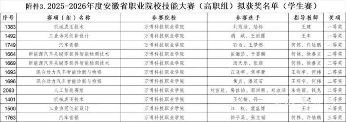 近日,安徽省教育厅公布了2025-2026年度安徽省职业院校技能大赛(高职组)获奖名单。万博科技职业学院参赛队伍凭借强大的实训设备和扎实的实践功底,一举斩获本次大赛一等奖3项、二等奖5项、三等奖3项,刷新了该校自参加全省职业院校技能大赛以来的参赛历史记录 。